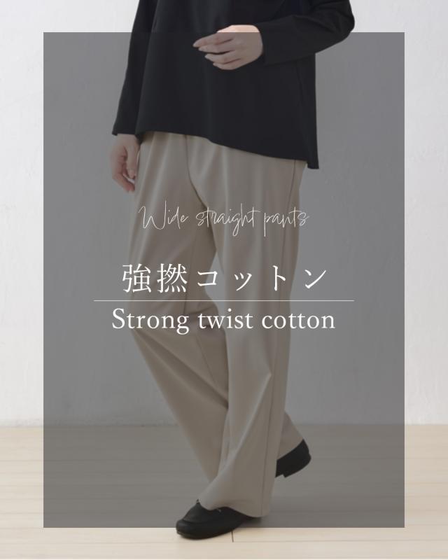 綿100%とは思えない上質感を生み出す着心地の良い強撚コットンを使用したワイドパンツ。