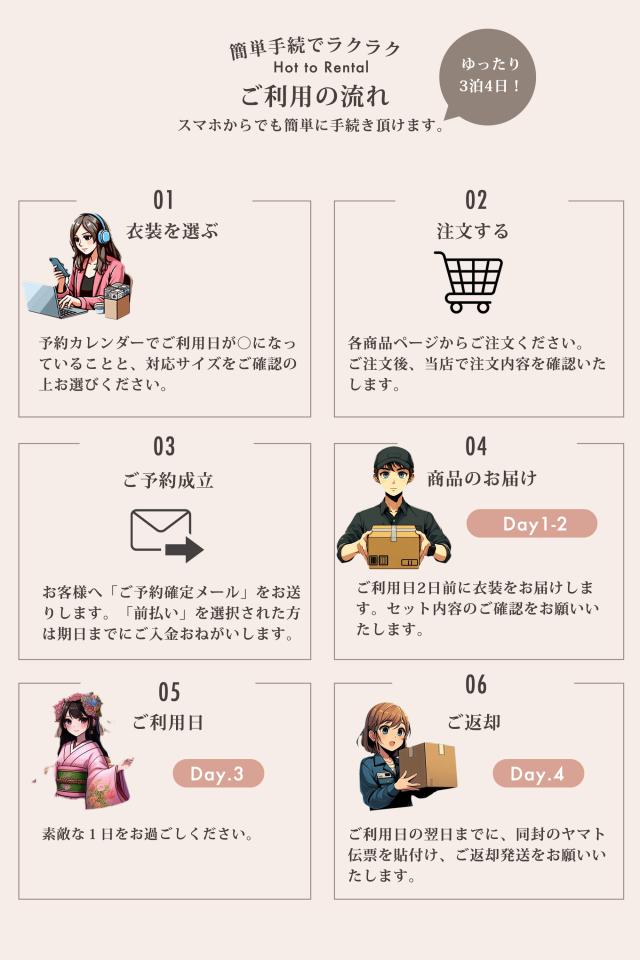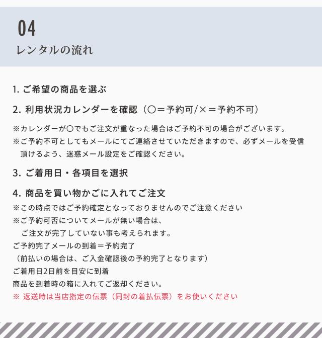 ●レンタル期間=3泊4日(ご着用日の2日前に到着するよう発送致します。)