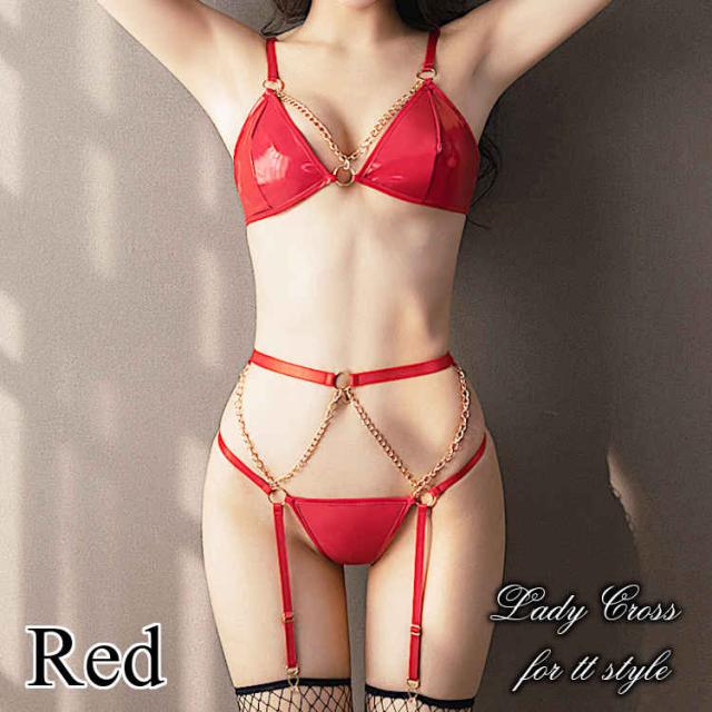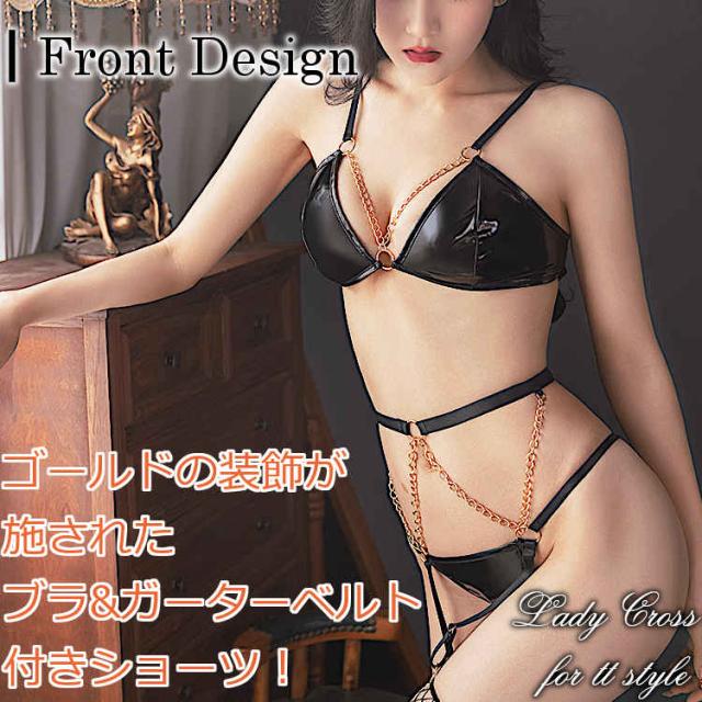 セクシーランジェリー セット ブラジャー エナメル ガーターベルト ブラ ショーツ Tバック ゴールドチェーン 超過激 下着 レディース インナー 2カラー 送料無料 ネコポス便