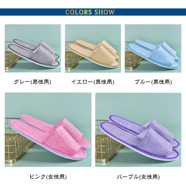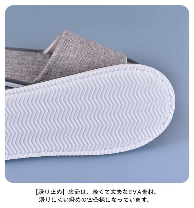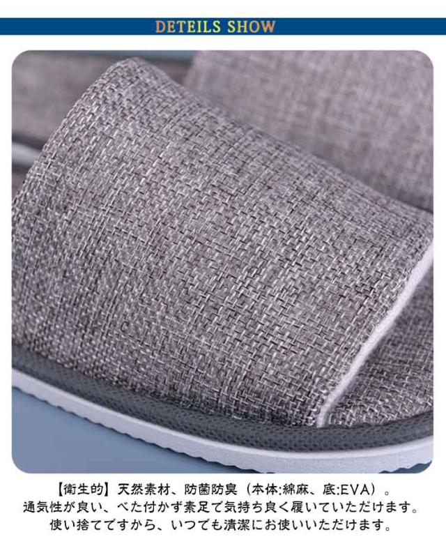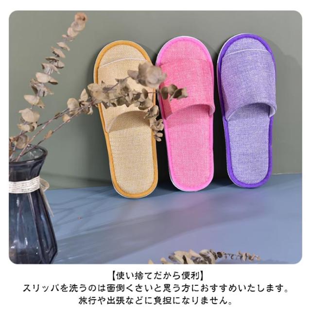| 【衛生的に使い捨て】【10足セット】【肌触りが良く蒸れない】【防菌防臭】 【衛生的】天然素材、防菌防臭(本体:綿麻、底:EVA)。通気性が良い、べた付かず素足で気持ち良く履いていただけます。使い捨てですから、いつでも清潔にお使いいただけます。 【滑り止め】底面は、軽くて丈夫なEVA素材、滑りにくい斜めの凹凸柄になっています。 【使い捨てだから便利】スリッパを洗うのは面倒くさいと思う方におすすめいたします。旅行や出張などに負担になりません。 【多用途】ホテル・旅館・病院・夜行バス・オフィス・飛行機・住宅展示場・モデルルーム・エステサロン・人間ドック・イベント会場・学園祭・文化祭・避難所等の備えに活躍。 | |