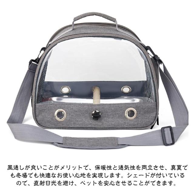 | 【鳥・小動物用】【キャリーバッグ】【持ち運び】 散歩、通院、旅行、日光浴、防災、避難などお出かけするのに大活躍の鳥用キャリー。ケージ掃除中の遊び場としても。 透明になっているため、中の様子がどの位置からでも確認することができ、ペットの様子を観察するのに便利で、より安心です。 インコや文鳥など小型の鳥類にぴったりのコンパクトなサイズ感です 手提げと肩掛け2wayで使用可能で利便性が高いです。ちょっとした移動・通院などの外出の際に持ち運びやすい! 風通しが良いことがメリットで、保暖性と通気性を両立させ、真夏でも冬場でも快適なお使い心地を実現します。シェードが付いているので、直射日光を避け、ペットを安心させることができます。 | |