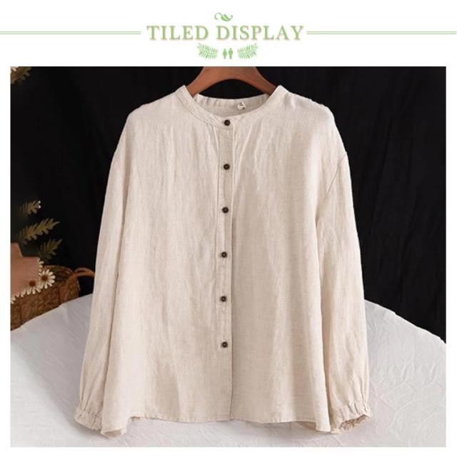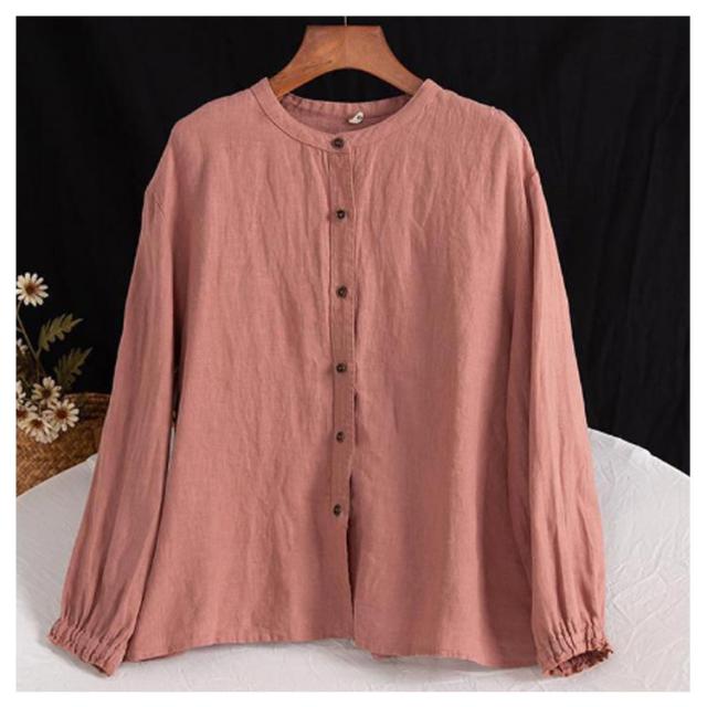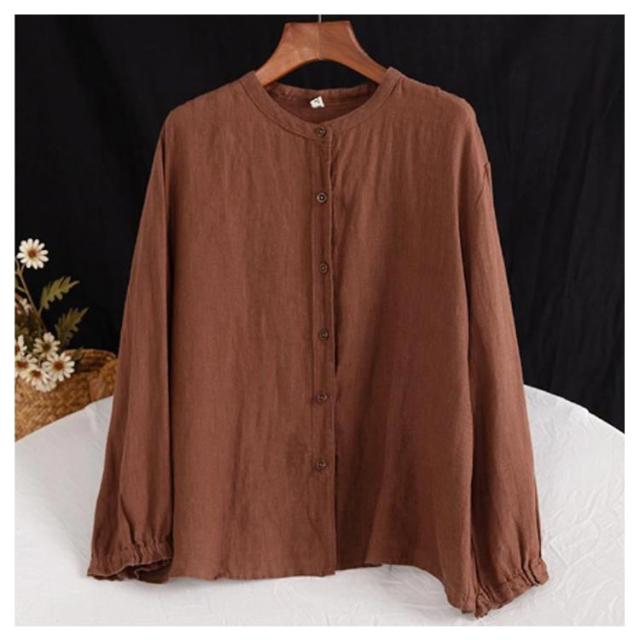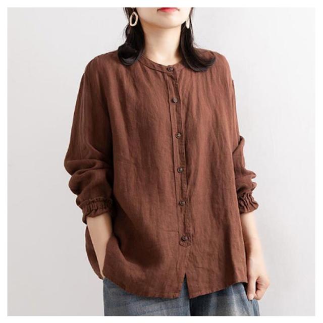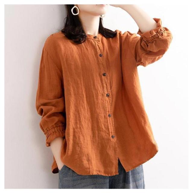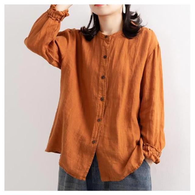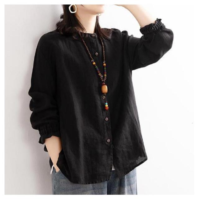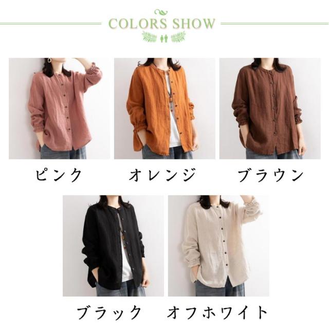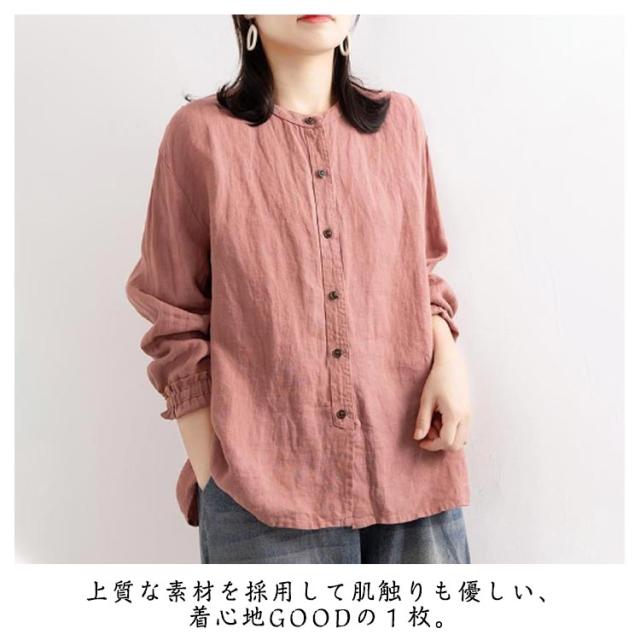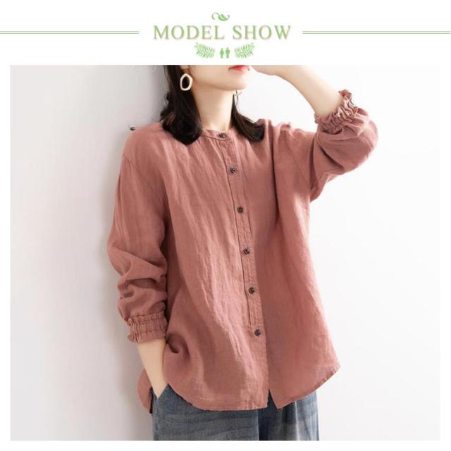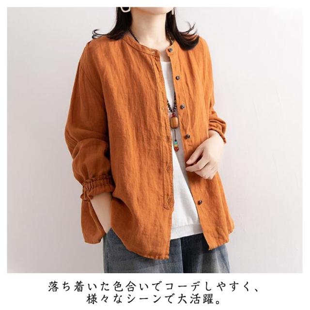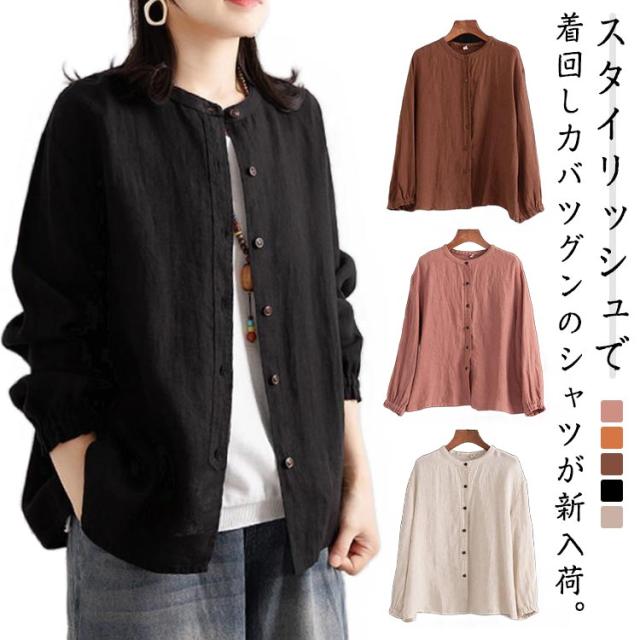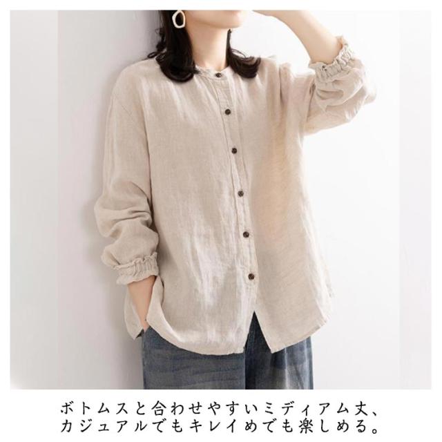 レディース シャツブラウス トップス シャツ シャツブラウス アウター 長袖 フリル 綿麻シャツ 袖ゴム バンドカラー タック カーディガン 羽織 シャツ ゆったり 無地 開襟 春 秋 大人可愛い
