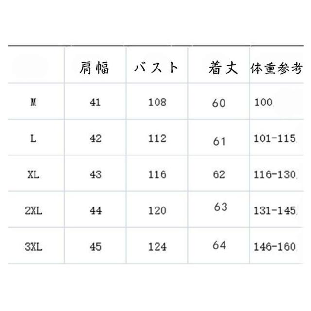 | サイズについての説明 | M 肩幅(41cm) バスト(108cm) 着丈(60cm) 体重参考(50kgまで) L 肩幅(42cm) バスト(112cm) 着丈(61cm) 体重参考(50.5-57.5kg) XL 肩幅(43cm) バスト(116cm) 着丈(62cm) 体重参考(58-65kg) 2XL 肩幅(44cm) バスト(120cm) 着丈(63cm) 体重参考(65.5-72.5kg) 3XL 肩幅(45cm) バスト(124cm) 着丈(64cm) 体重参考(73-80kg) ※サイズ表の実寸法は商品によって1-2cm程度の誤差がある場合がございます。 |