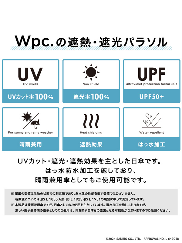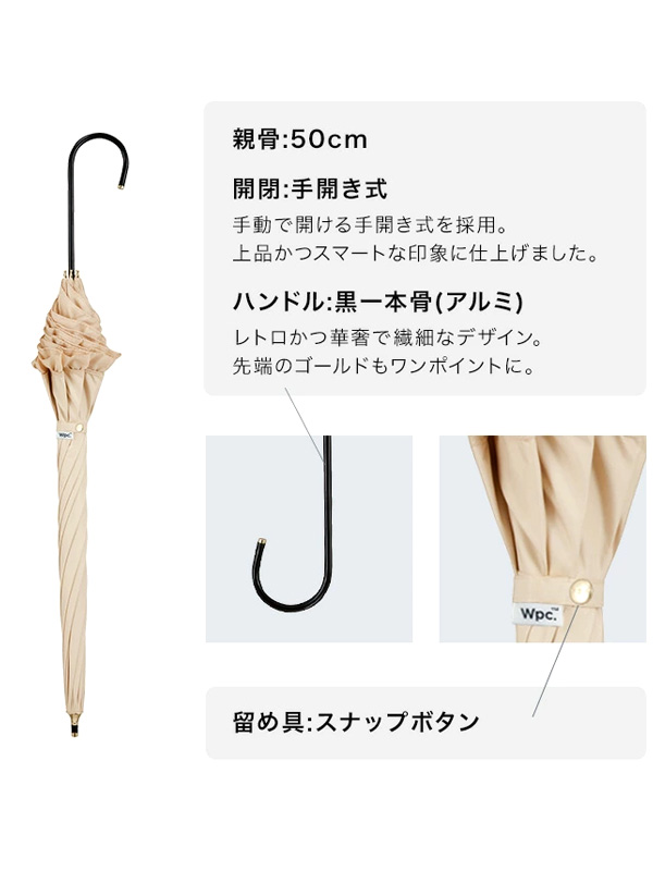 Wpc Blackout classic ruffle parasol Wpc 遮光クラシックフリル 日傘 【Wpc(ダブルピーシー)】 「新たな可能性を生み出す」をスローガンに2004年に誕生したドメスティックブランド。 様々な世代・ジャンルに合った方へ、雨の日だけでなく、天気によって変わる”ライフスタイリング”を提案していきます。 そして。ご愛用いただけるお客様の毎日が楽しくなる製品をお届けします。 上品なフリルが大人気!完全遮光100%生地を使用したフェミニンな長日傘 ギャザーを寄せすぎず、上品で可愛いフリルが大人気の長日傘。 長時間外出する日にぴったりな、さっと開閉できる長傘タイプ。 レトロかつ華奢で繊細なデザインのハンドルは、先端のゴールドがワンポイントで、持つ人に女性らしい印象を与えます。 【遮光率・UVカット率100%、UPF50+ 完全遮光日傘】 全カラー遮光率・UVカット率ともに100%、UPF50+を実現し、日差しからお肌を守ります。 日焼けを防ぐために必要なUVカットの性能を兼ね揃えた、紫外線対策にはピッタリの日傘です。 涼しく過ごすための遮熱性も優れているため、暑い夏の熱中症対策にも。 ※記載の遮光率・紫外線遮蔽(UVカット)率・UPF値は生地の状態での測定値です。 傘本体の性能を示す数値ではございません。 また、生地に施された刺繍・縫製などUV加工生地以外の部分もその限りではありません。 【雨の日も使える日傘(晴雨兼用)】 この製品は日傘としてお使い頂くことを主としていますが、はっ水防水加工を施しているため雨傘としてもお使いいただけます。 ※激しい雨や長時間の雨傘としてのご使用は雨漏りや色落ちの原因となる可能性がございます。 またデザインの特性上、完全な防水はっ水加工が難しい場合があり、雨が染み込むことがありますのでご注意ください。 [開閉方法] 手動で開ける手開き式。 開閉時の動作に上品さを感じられ、狭い場所や近くに人がいる場合でもそっと開閉できます。 ご使用になる前に製品に付属しているご使用上の注意をお読みください。 | ||||||||||