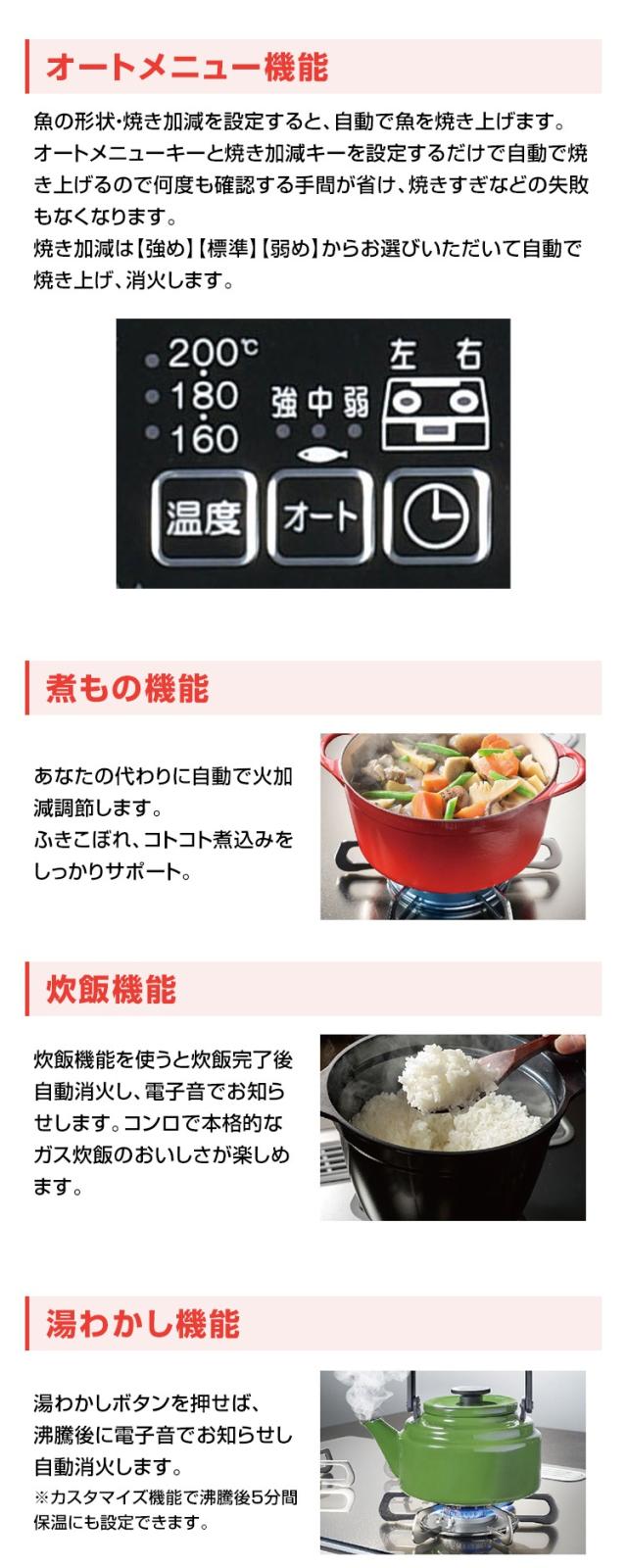 炊飯機能を使うと炊飯完了後自動消火し、電子音でお知らせします。コンロで本格的なガス炊飯のおいしさが楽しめます。