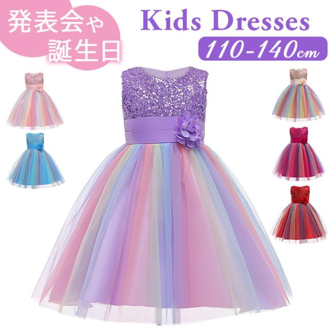 ドレス 子供 肩出し 通販 子供ドレス フォーマルドレス 女の子 キッズ ワンピース 虹色 ピアノ 発表会 結婚式 お呼ばれ キラキラ スパンコール 花 フラワー チュールドレス 七五三