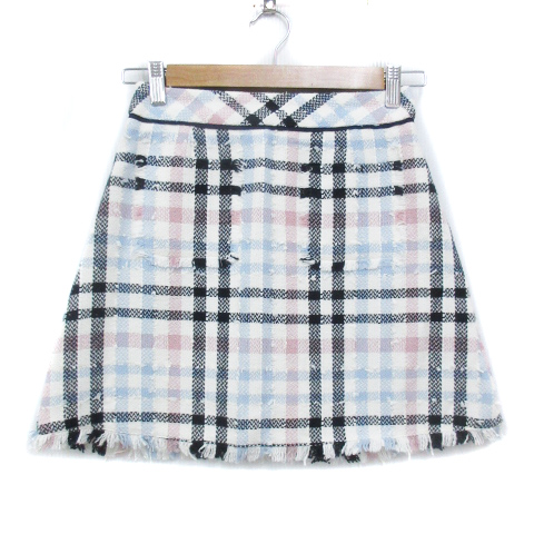 【中古】リランドチュール ツイードスカート 台形スカート ミニ丈 ラメ フリンジ チェック柄 0 白 水色 レディース