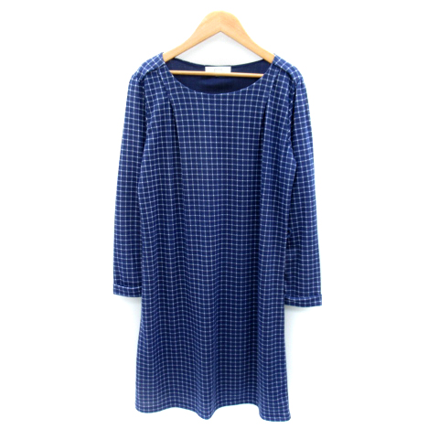 【中古】グローブ grove ワンピース ひざ丈 長袖 ラウンドネック チェック柄 ロールアップ L 紺 ネイビー レディース
