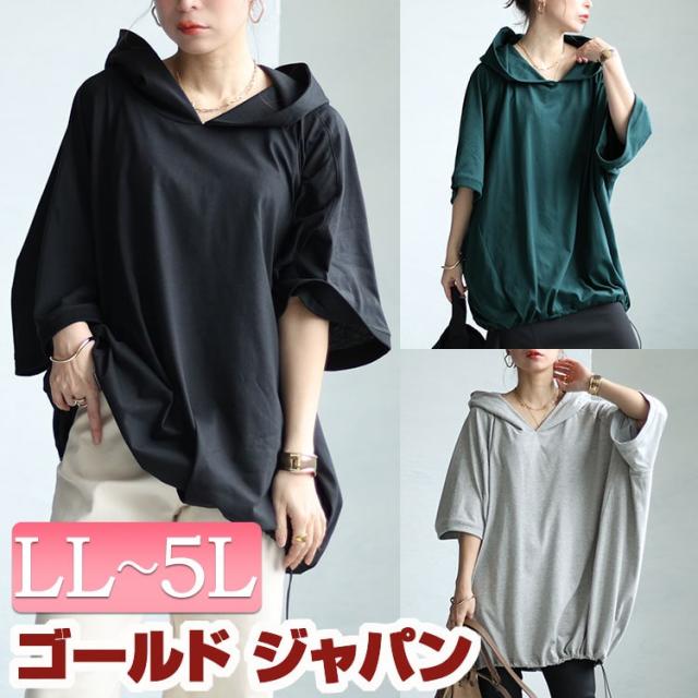 春新作 大きいサイズ レディース チュニック 裾ドロストラグランパーカーチュニック パーカー フード フーディー ドルマン ラグラン ドローコード ドロスト 5分袖 バルーン ストレッチ 春服 夏服 秋服 LL 2L 3L 4L 5L ブラック 黒 杢グレー ダークグリーン ゴールドジャパン