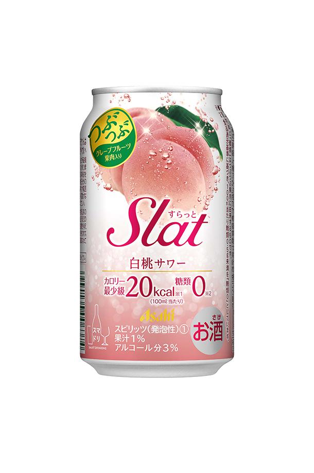 Slat(すらっと)は「カロリー最少級20kcal(100mlあたり)(※1)」「糖類ゼロ(※2)」のさわやかなおいしさの缶チューハイです。健康意識に配慮した特長にくわえ、つぶつぶの果肉やアロエによる食感を楽しめる、アルコール度数3%の缶チューハイです。2009年の発売以来、30〜50代の女性を中心に支持されています。