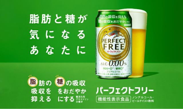 パーフェクトフリーは、「脂肪の吸収を抑える」「糖の吸収をおだやかにする」というダブルの機能を持つ、難消化性デキストリンを配合した、機能性表示食品制度対応のノンアルコール・ビールテイスト飲料です。