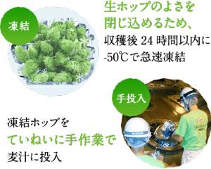 ![]() | 香りや苦味を与えることから「ビールの魂」とも言われる原料「ホップ」。一番搾り とれたてホップ 生ビールでは、ホップの鮮度を守るために細心の注意を払っています。 輸送中はトラック内の酸素を追い出し、−20度で冷凍工場へ。ホップは収穫後24時間以内に−50度で急速凍結しています。 香りの良さを保つため、凍結したままのホップを−40度で粉砕し、冷凍保管。そして、凍結ホップを麦汁へ投入する際は、手作業で丁寧に行なっています。 |