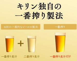![]() | 「一番搾り製法」とは、麦汁ろ過工程で、最初に流れる一番搾り麦汁だけを使う独自の製法。 二番搾り麦汁は一切使わず、一番搾り麦汁だけでつくる一番搾りは、まさに“麦のおいしいところだけ”を搾った、渋みが少なく上品ですっきりした味になります。 一番搾り とれたてホップ 生ビールでは、さらに今年収穫したばかりのホップを使用してつくられることで、とれたてホップのおいしさが感じられる、調和のとれた飲みやすい味わいを実現しました。 |