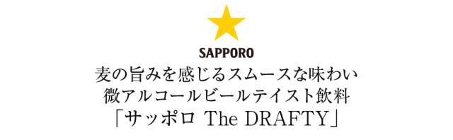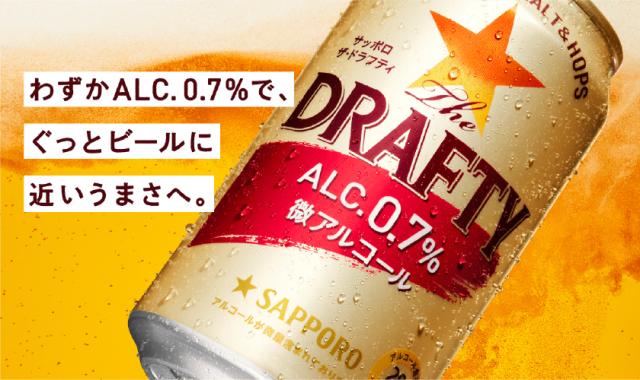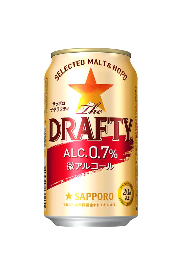 サッポロ The DRAFTYは、酔い過ぎたくないニーズや健康志向の高まりに応える、アルコール分わずか0.7%の微アルコール・ビールテイスト飲料です。低アルコールでありながら、ビールに近いうまさをしっかりと感じられる味わいが特長です。