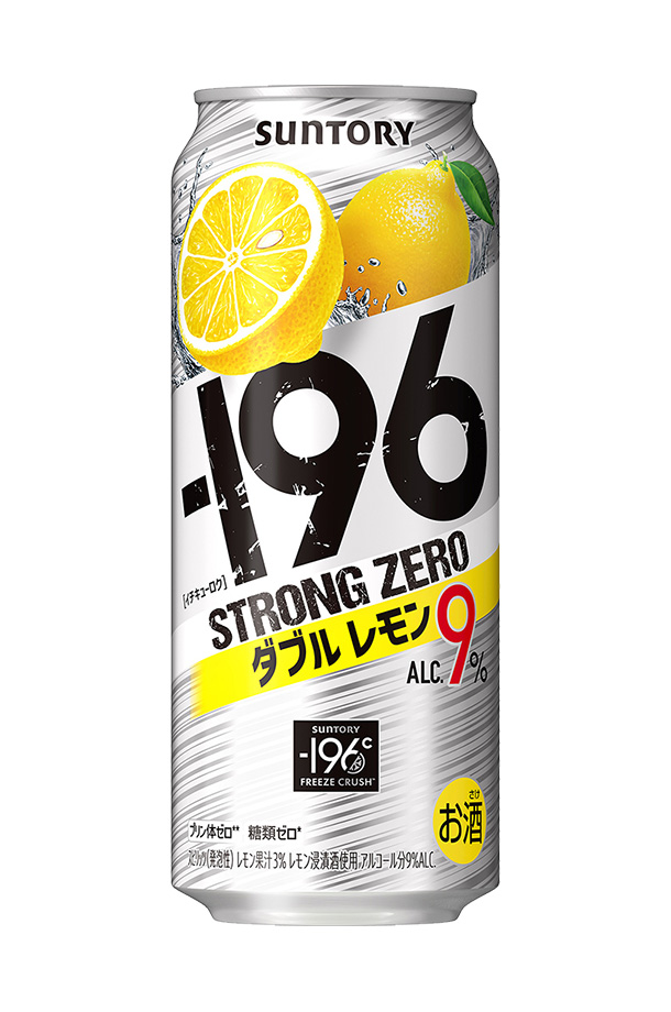 | −196ストロングゼロ ダブルレモンは、“−196℃製法”による果実の浸漬酒と果汁をダブルで使用。“アルコール度数高めの飲みごたえ”と“しっかりとしたレモンの果実感”が特長です。 −196シリーズは“−196℃製法”による、皮や種に含まれる果実本来のうまみや複雑味を今まで以上に引き出した“しっかりとした果実感”が特長です。 (※1)100mlあたり0.5mg未満を「プリン体ゼロ」としています。 (※2)食品表示基準に基づき、100mlあたり0.5g未満を「糖類ゼロ」としています。 |