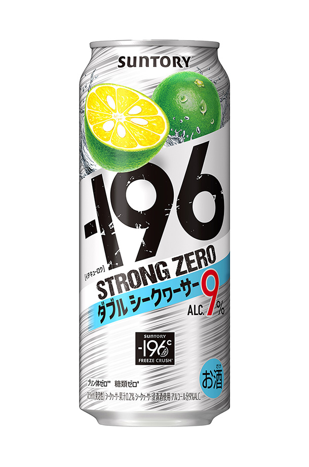 | シークワーサー浸漬酒と果汁を使用 -196℃ STRONG ZERO Double Shekwasha サントリー イチキューロク ALC.9% プリン体ゼロ(※1) 糖類ゼロ(※2) |