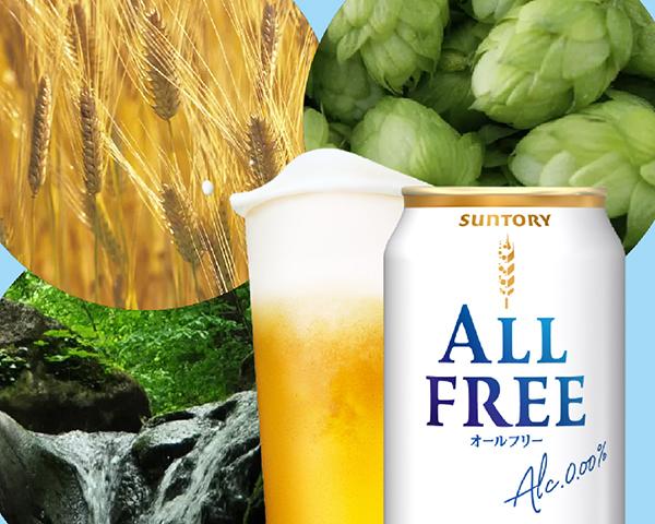 サントリー「オールフリー」は、ランチに、アウトドアに、休肝日に。何も気にせずいつでもリフレッシュできる“アルコール度数0.00%・カロリーゼロ(※1)・糖質ゼロ(※2)・プリン体ゼロ(※3)”の4つのゼロを実現したノンアルコールビールテイスト飲料。