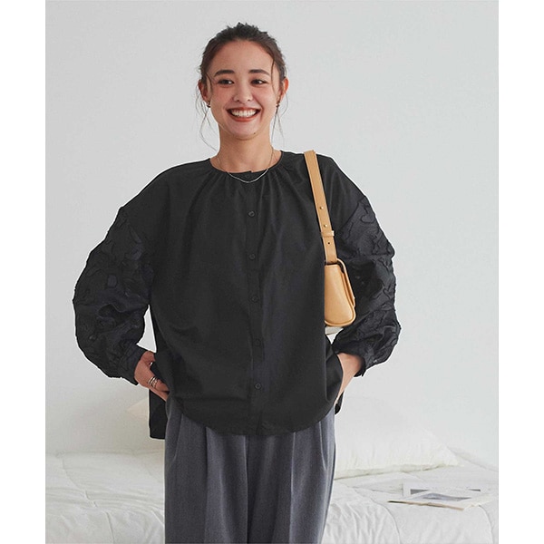 ・シアージャガード素材のドッキングスリーブが高見えするデザインブラウス。