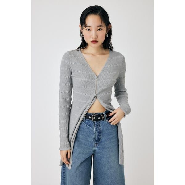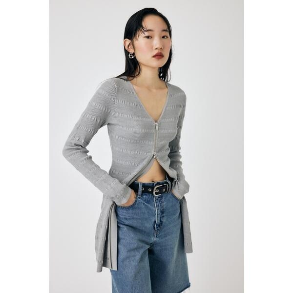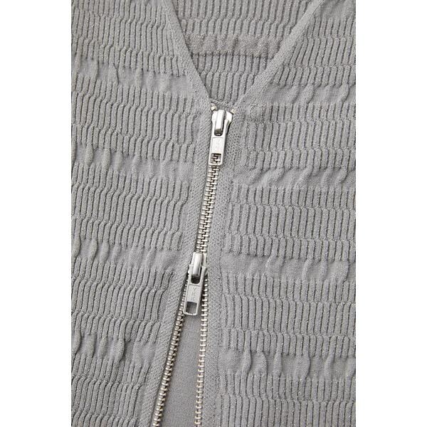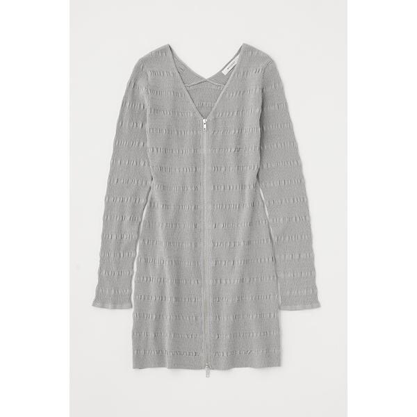 【OPEN STITCH KNIT MINI DRESS】程よいフィット感がありながら凹凸感のある編み地でボディラインを拾いすぎず、スタイルアップできるニットワンピース。フロントのメタルファスナーがクールなアクセントになっています。ロングトップスとしてパンツを合わせるのも素敵です。■透け感:なし■光沢感:なし■伸縮性:あり■裏地:なし