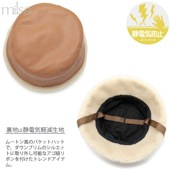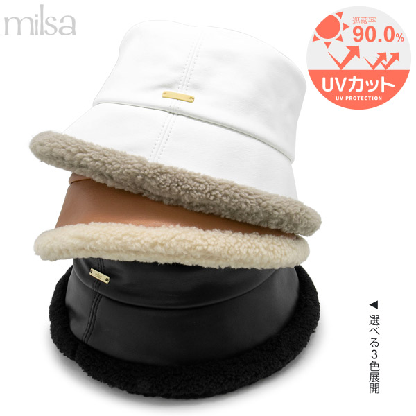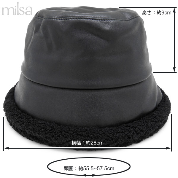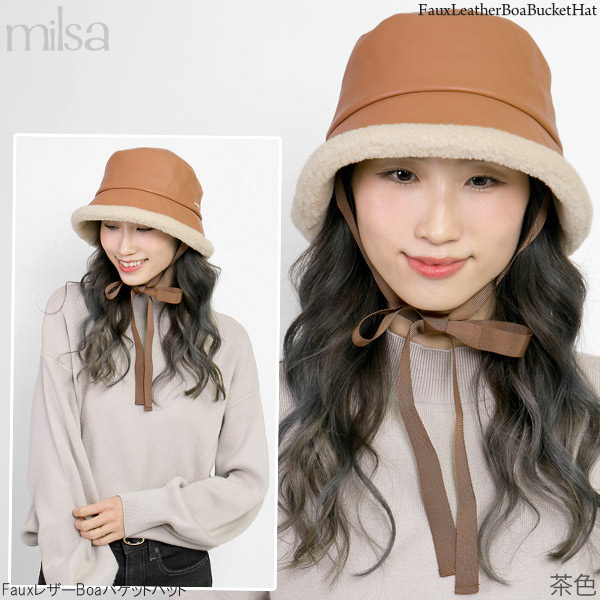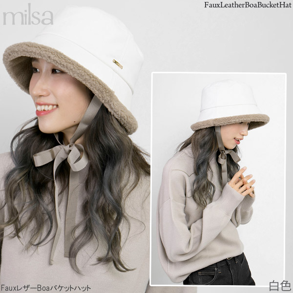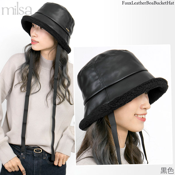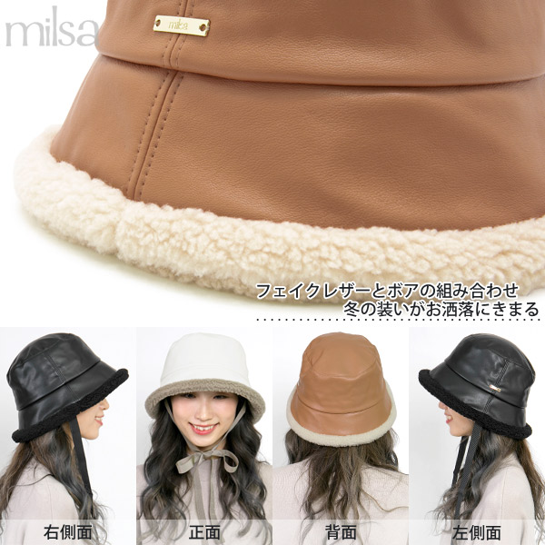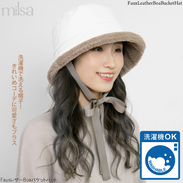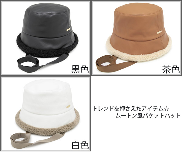 ハット 洗える [メール便可] 帽子 レディース 秋冬 ボア あご紐 ムートン UV / FauxレザーBoaバケットハット