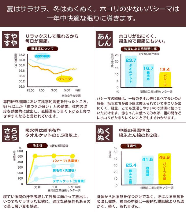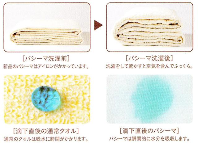 「洗うこと」でより優しい手触りに。 パシーマは「洗うこと」でよりふっくらと長く使えるのも特長のひとつ。簡単に洗濯できて、ダニやホコリも洗い流せるから、いつでも清潔な状態に。しかも洗うたびに肌になじんでいくため、何回洗っても気持ちのいい肌ざわりが続いていきます。 |