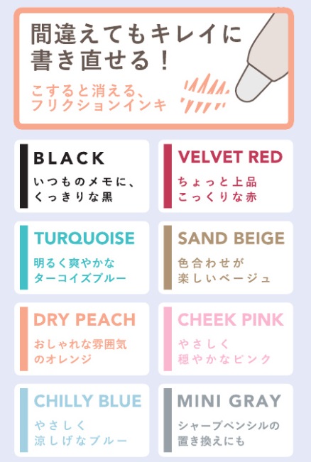 ブラック以外の7色は今までのフリクションには無かった中間色。 「ベルベットレッド」や「ターコイズ」のように“おしゃれにひとくせ” をコンセプトにした8色となっています。