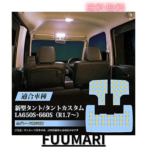 製品情報:LEDルームランプ セット、適合車種: ダイハツ 新型 タント/タントカスタム,型式: LA650S LA660S,年式: R1.7~ 専用 、発光カラー: 電球色 3500K、ルームランプセット内容: フロントルームライト×2、センタールームライト×1、全3点。※サンルーフ付きの車、LED仕様車には対応不可です。