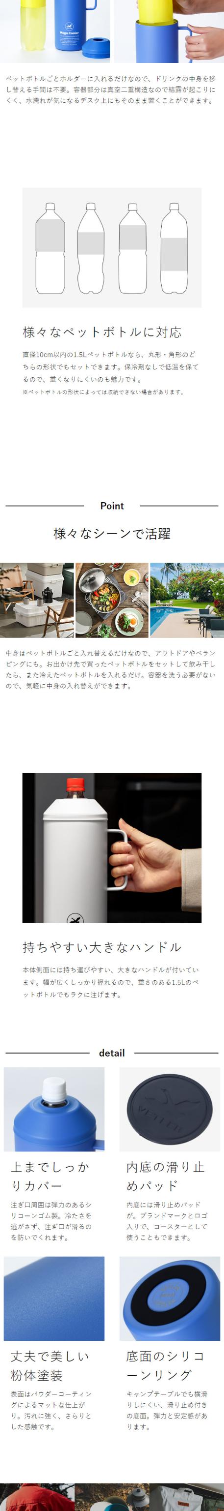 1.5Lペットボトル対応 ジュースの冷たさキープ スポーツ大会や屋外イベント、パーティー、たっぷりドリンクを飲みたい暑い日にはひんやり冷えた大容量ペットボトルを用意したいもの。1.5L対応のペットボトルクーラー『 VETLER メガクーラー 』なら、ペットボトルごと入れて、保冷したまま注げるのが◎。成分的に水筒には入れられないスポーツ飲料や炭酸ジュースなどにもおすすめです。丸型、四角どちらのペットボトル形状にも対応しており、持ちやすいハンドル付き。優れた真空断熱構造で冷たさを長時間キープします。