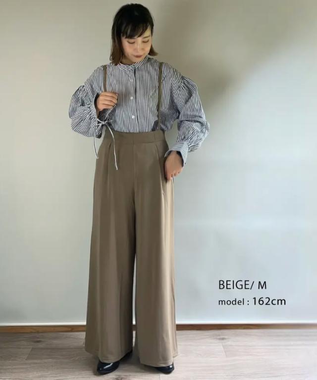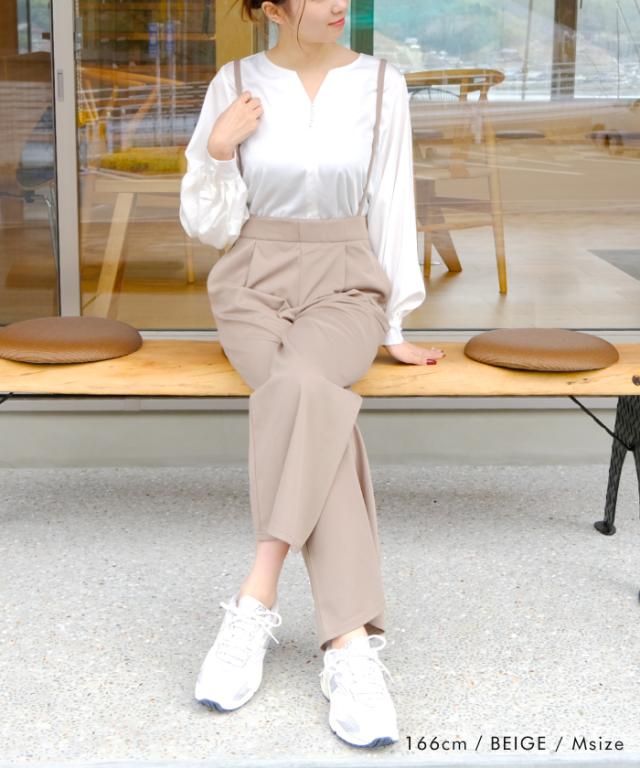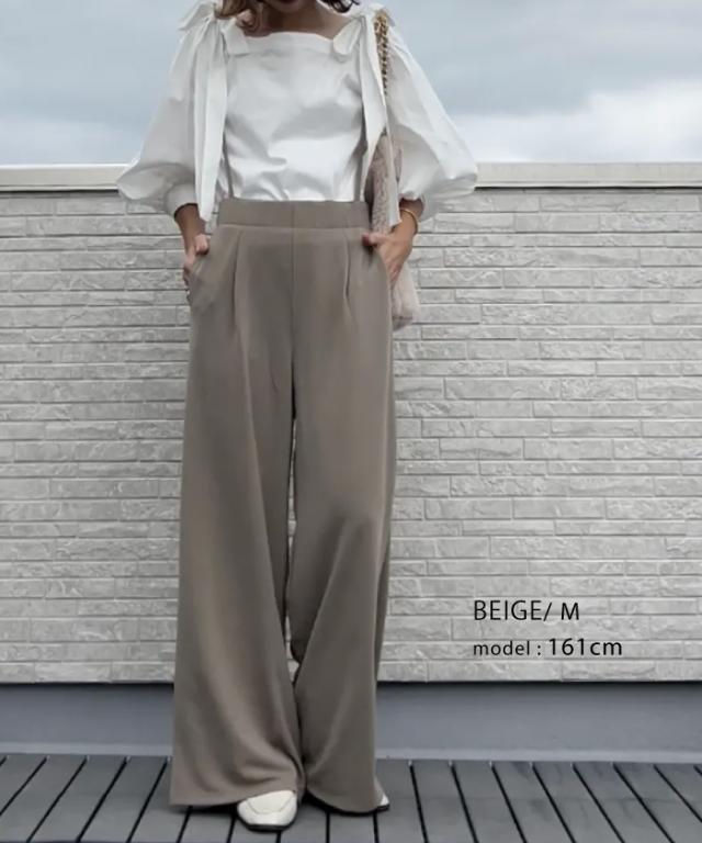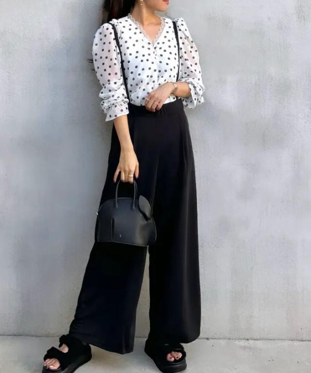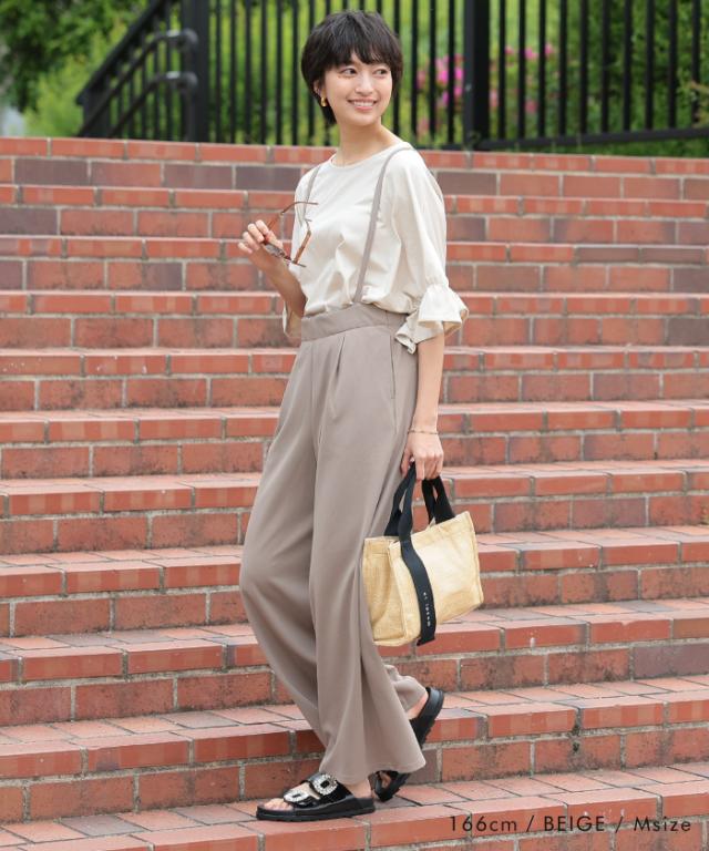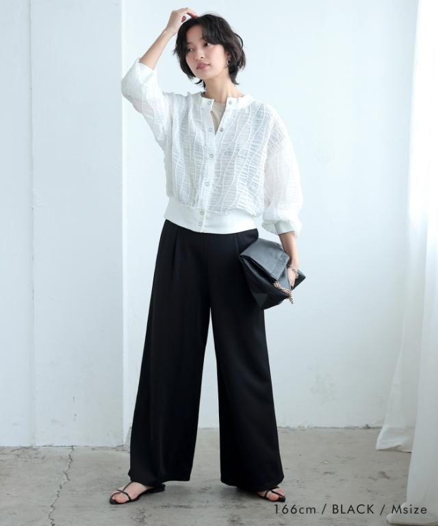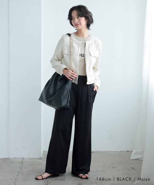 体型カバーもできる程よいワイドパンツのシルエットは、大人のきれいめな着こなしにマッチ。