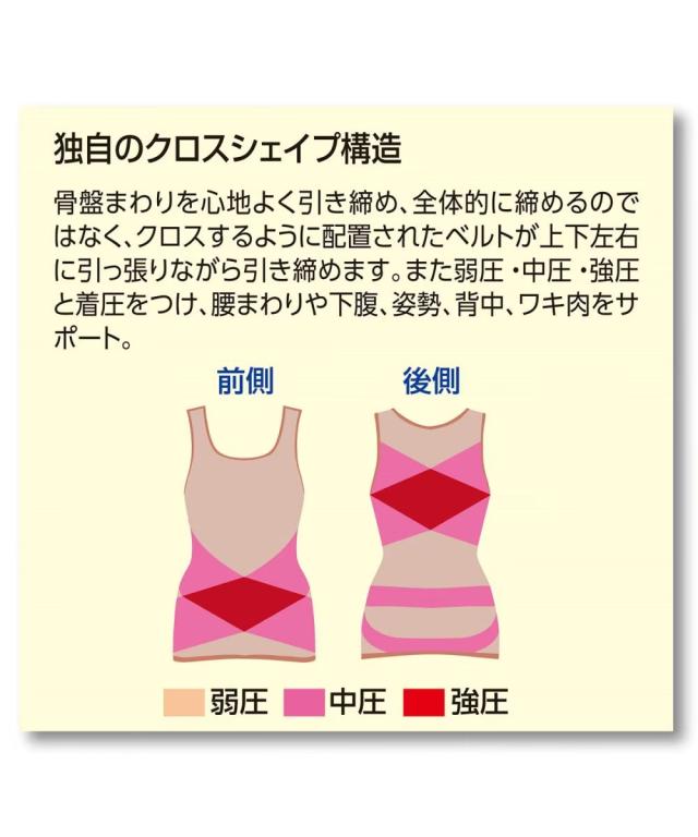 また弱圧・中圧・強圧と着圧をつけ、腰まわりや下腹、姿勢、背中、ワキ肉をサポート。