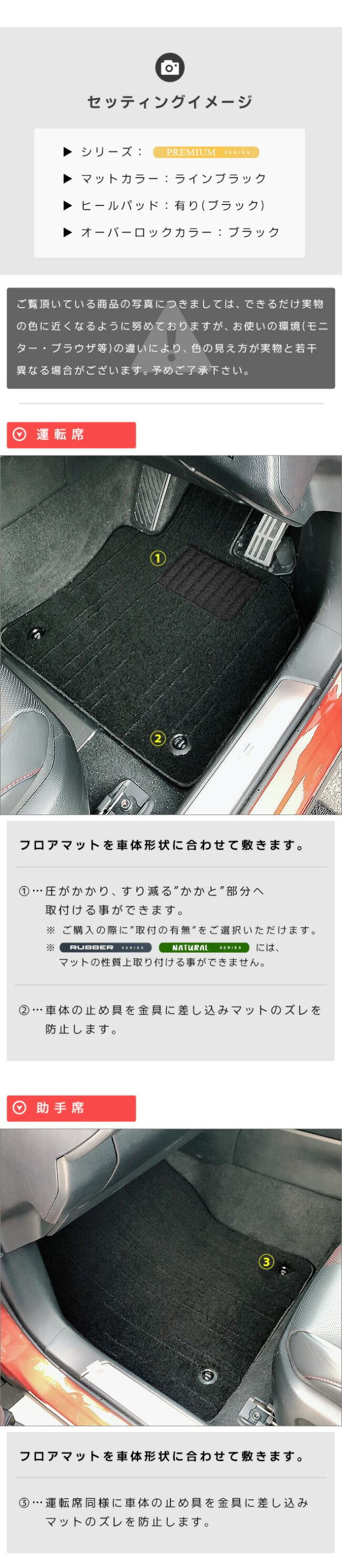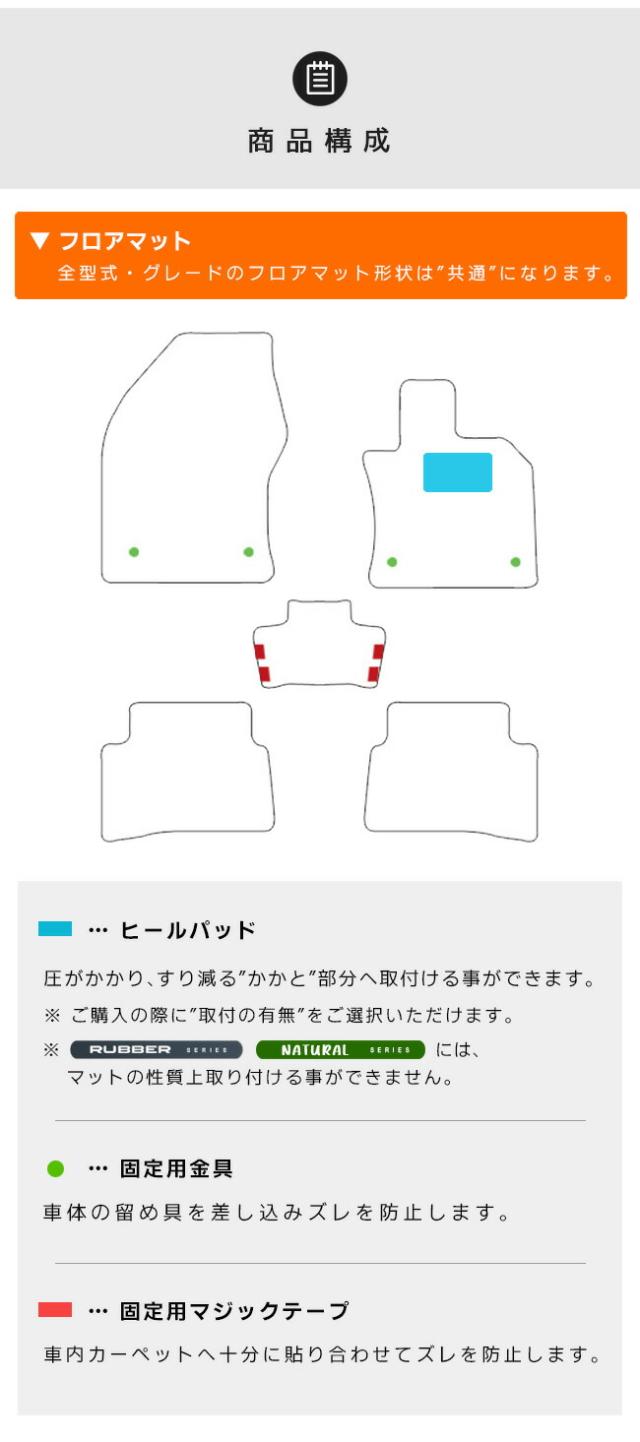 | 商品構成 | 専用フロアマット 5枚 ・運転席 1枚 ・助手席 1枚 ・後部座席 3枚 専用ラゲッジマット 1〜3枚 ※ 年式・エンジンタイプ、スペアタイヤの有無により枚数が異なります。 ※ ご購入の際は適合する項目をご選択ください。 |