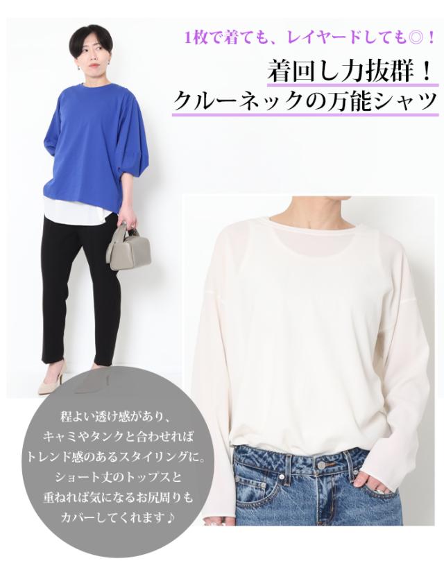 1枚で着ても、レイヤードしても◎ 着回し力抜群のクルーネック万能シャツ。 程よい透け感があり、キャミやタンクと合わせればトレンド感のあるスタイリングに。ショート丈のトップスと重ねれば気になるお尻周りをカバーしてくれます。 やや透け感があり、ドレープの美しい上品な素材。お洗濯方法は「手洗い可能」なので、お家で簡単にお手入れできるのも嬉しいポイントです。 |