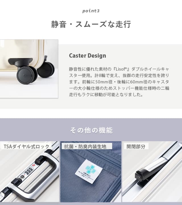 - 静音性に優れた素材の『Lisof®』大型50ミリ径のダブルホイールキャスター使用。
