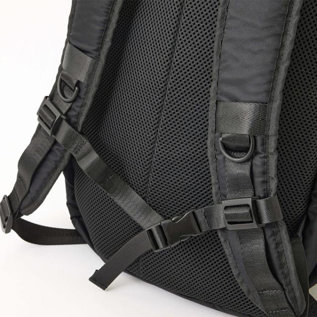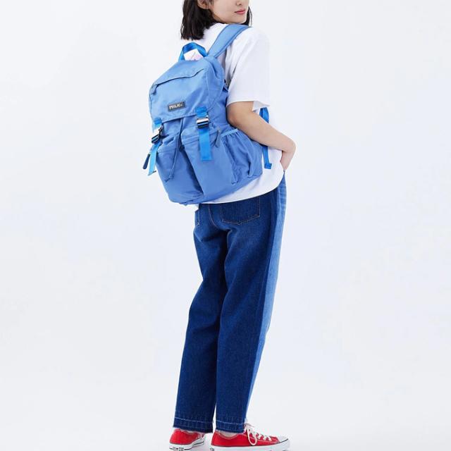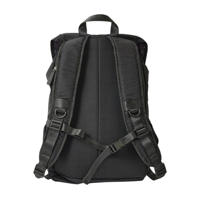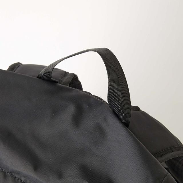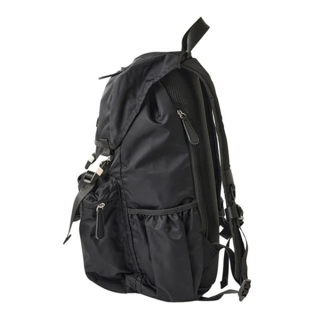 ■ツヤっとした生地感、シルバーのメタルバックル、ロゴプレートをポイントにした、大人でも持ちやすいバックパック