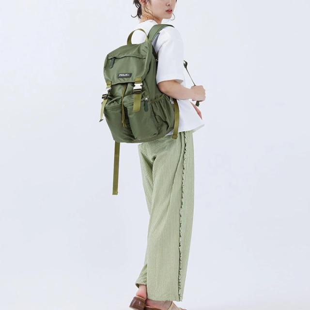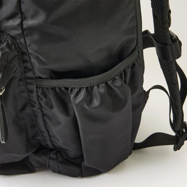 ■縦長のマチ付きフロントポケット、サイドにはドリンクボトルや傘を収納しやすいポケット付き