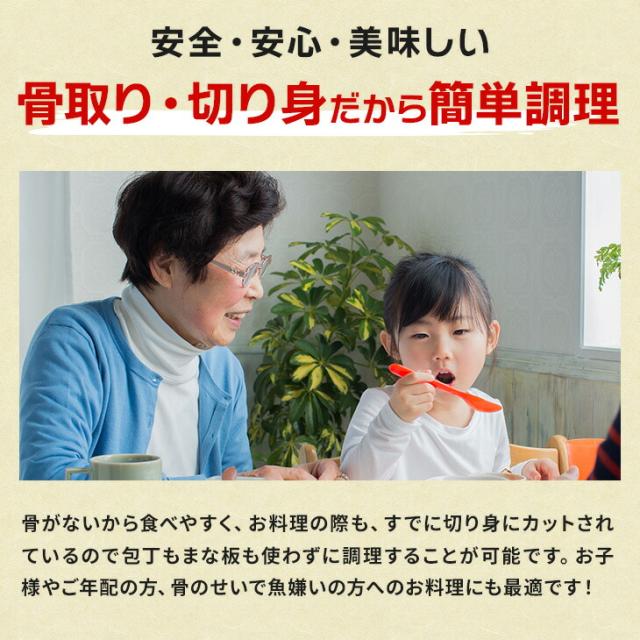 - 骨が取ってあり脂も乗っていて身が大きくてとってもお得感があります。高齢の父も安心して食べられます。