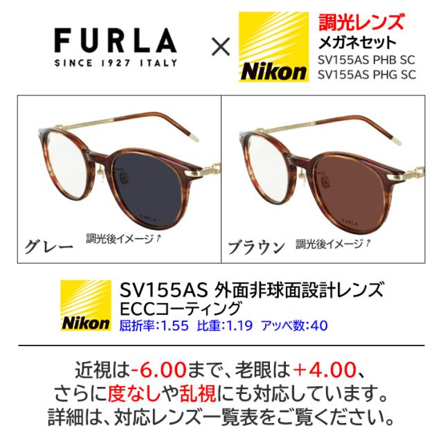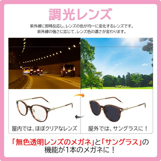 | 商品詳細 フルラ メガネフレーム+薄型 非球面 調光レンズセット レディースモデル。 ・ホールブリッジのあるベーシックなボストン型。 ・ファッション性の高いコンビモデルで、クリングス付きで掛けやすい ・透け感があり肌に馴染むカラーのフロント生地 ・肌なじみの良いメッキカラーのテンプル ・FURLAアーチロゴをモチーフにしたテンプル飾りとラウンドシェイプのモダン ・しのみ先のレーザーFURLAロゴと貼り合わせ生地がワンポイント 近眼 度数は-6.00まで、老眼度数は+4.00まで対応。 乱視にも対応しています。 度なし の調光レンズ0.00にも対応しています。 詳細は、対応レンズ 一覧表をご覧ください。 グレー調光とブラウン調光の2種類をご用意。 調光レンズ 「無色透明レンズのメガネ」と「サングラス」の機能が1本のメガネに! レンズに練りこまれた「調光素材」が紫外線に反応して、レンズの色が変わります。 屋内など紫外線が当たらない時はほぼクリアのレンズ。 屋外では、紫外線がレンズに当たるとレンズの色が変化し、サングラスに。 ※ご使用状況によって、調光しない場合もございます。調光レンズの特性をご確認のうえ、お買い求めお願いします | |