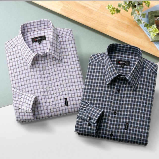 Pierucci(ピエルッチ)格子柄シアサッカー長袖シャツ2色組 (メンズ 男性用 紳士用 長袖 2枚組 凹凸 敬老の日 )
