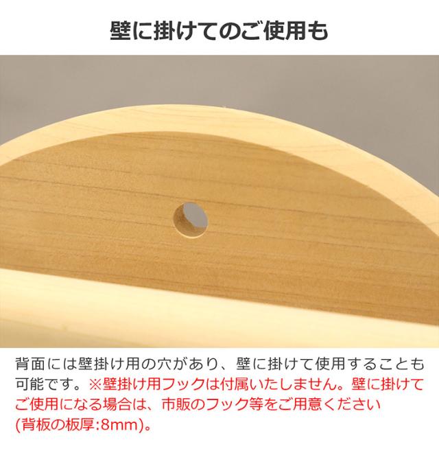 壁掛け用の穴はありますが、当商品は壁掛け用フックは付属いたしません。壁に掛けてご使用になる場合は、市販のフック等をご用意ください(背板の板厚:3mm)。