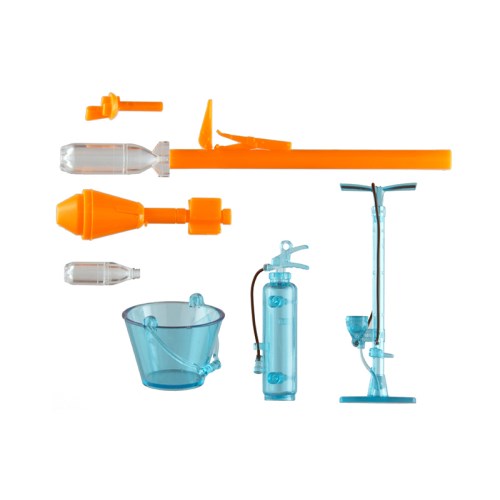 クリアライトブルーとクリア、オレンジの3色による成型。ロケット部はペットボトルとリアル弾頭の3種が選択可能。さらに、発射用の水と圧縮空気を扱う為のバケツ&エアポンプを情景小物として用意。消火器型水鉄砲もオマケで付けました。ホースに見立てたワイヤーも付属します。