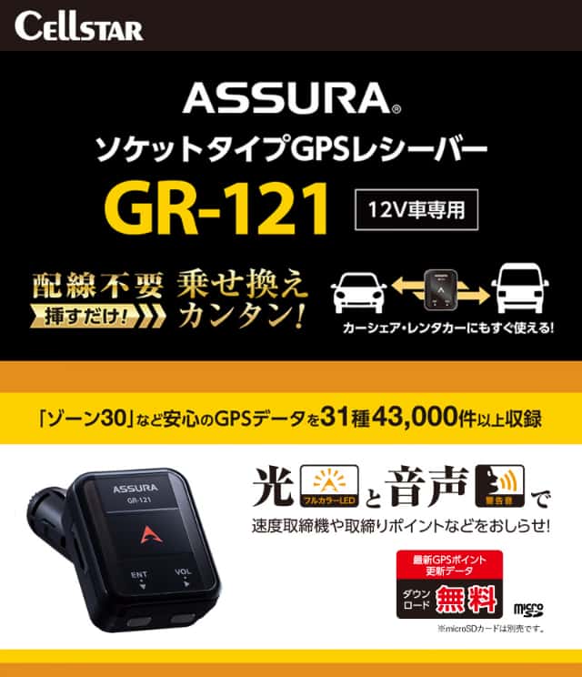 セルスター ソケットタイプGPSレシーバー GR-121 一体型 配線不要 乗せ換え簡単 速度取締警告 探知機 超速GPS 12V車専用 カーシェア レンタカー 日本製 3年保証