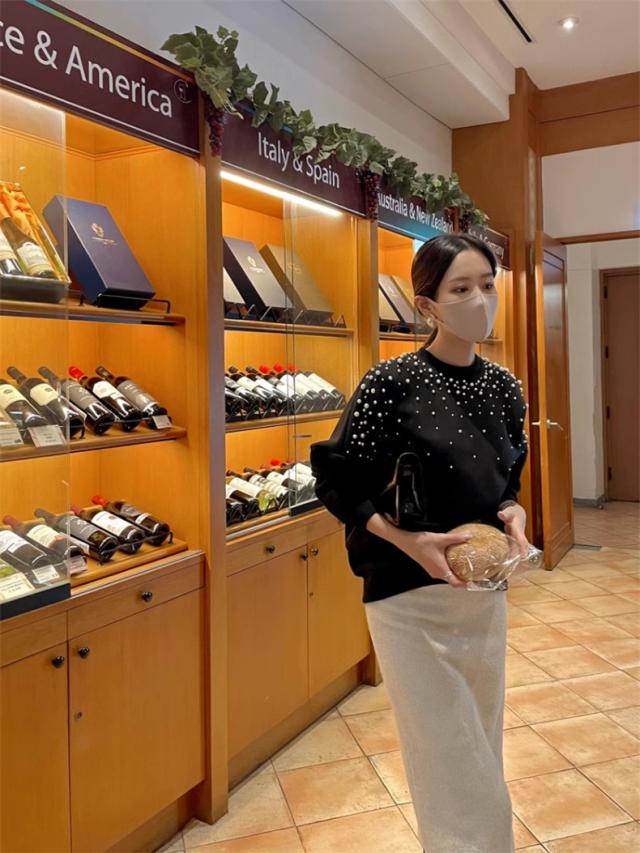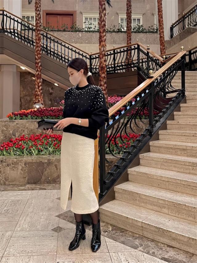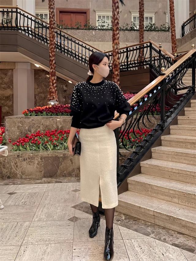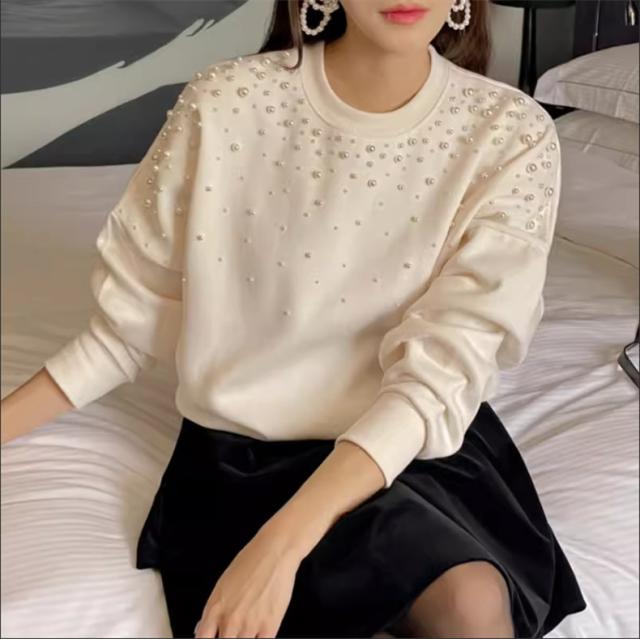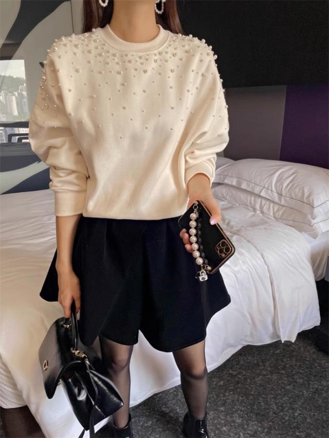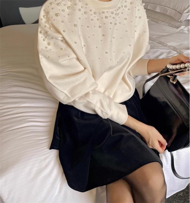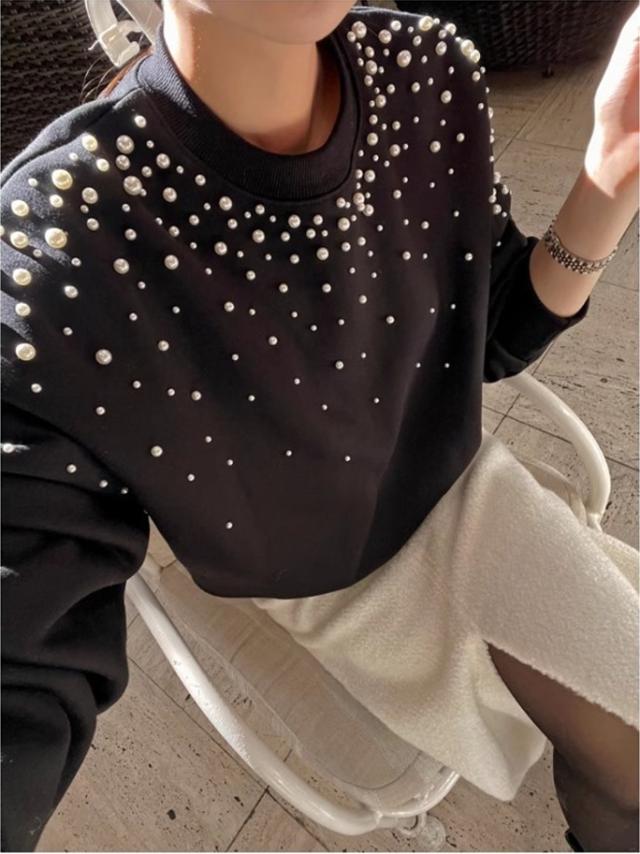 パール付き スウェット レディース 春トップス トレーナー クルーネック ショート丈 ビジュー ボリューム袖 さりげなく体型カバー プルオーバー 可愛い