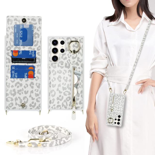 S23 Ultra ケース 手帳型 上下開 ショルダー リング付きケース ストラップケース リングケース ポシェット ストラップ S23 Ultra 5G ケース ショルダーケース S23Ultra ケース カバー SC-52D docomo SCG20 au 対応 サムスン S23 ウルトラ SCG20 SC52D ケース カバー S23ウルトラ カバー サムスン ギャラクシー S23ultra スマホケース 携帯カバー 財布 ポシェットケース 適用 case iCoverCase ストラップ カードケース カード収納 スナップ式 横置き スタント 肩がけ 首掛け 斜め掛け ファスナー ストラップ付き ショルダーケース カード入れ カバー スマホケース 携帯カバー 豹柄 ヒョウ柄 ホワイト