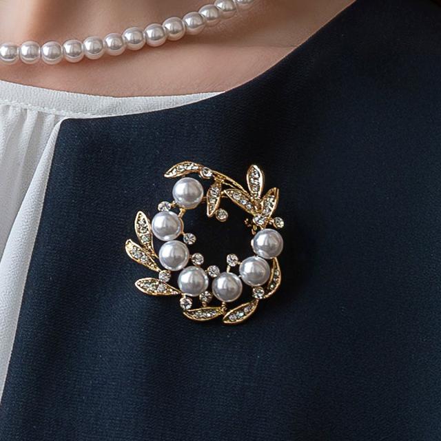 煌めくビジューとパールが優美な印象のリングブローチ。円形に並べたパールと立体的なリーフモチーフに散りばめられたビジューがエレガントな煌めきを放ちます。お祝いシーンなどにぴったりな女性らしいひと品。