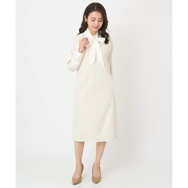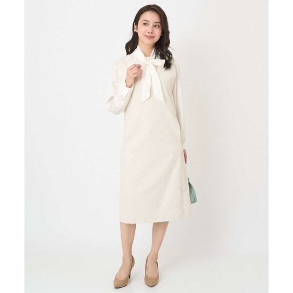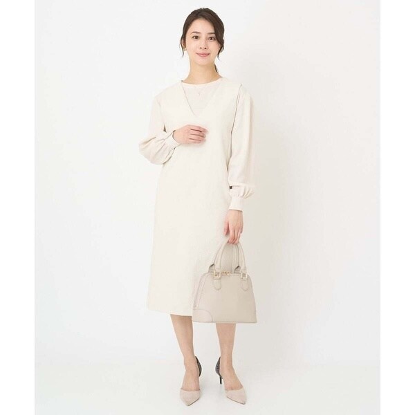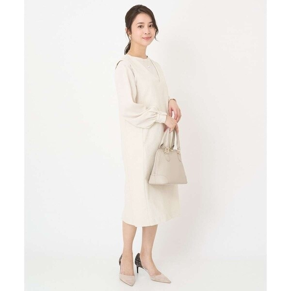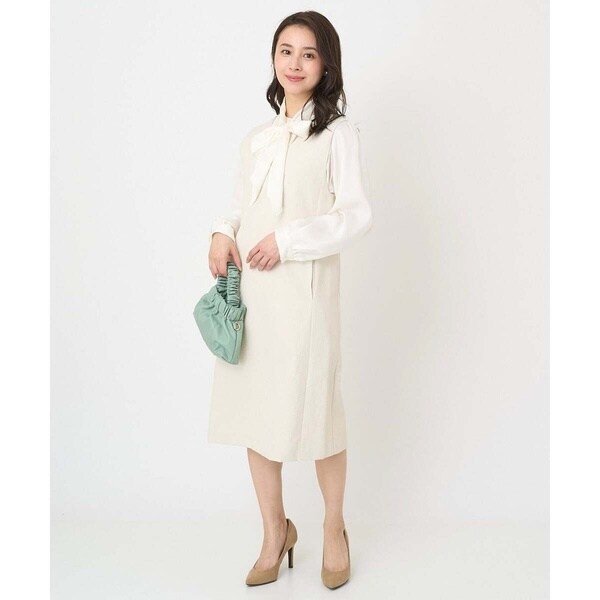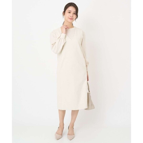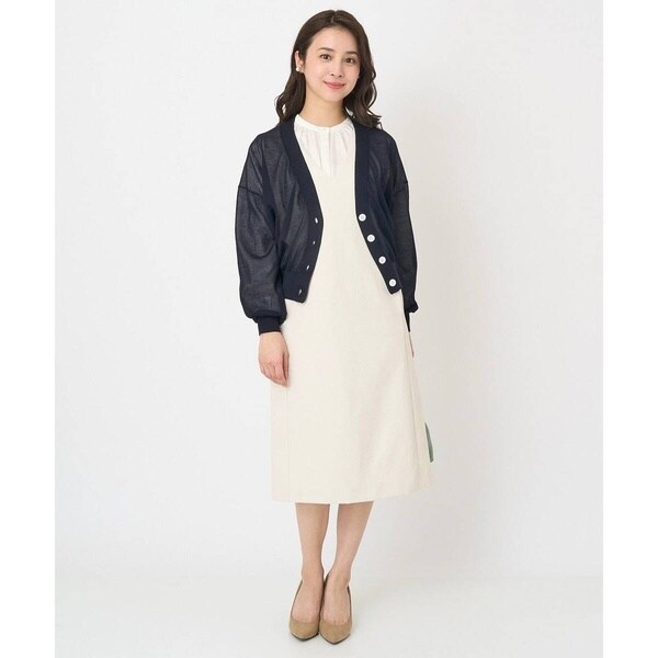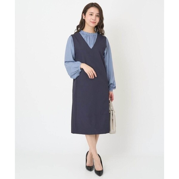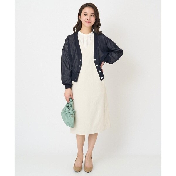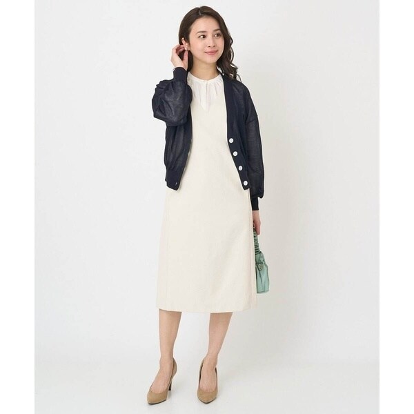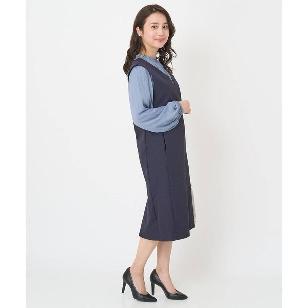 真っすぐ落ちたシルエットと深めに開いたVネックのラインが大人っぽく着こなせるジャンパースカート。無地ながらも表面感のある素材が上品に着こなせます。