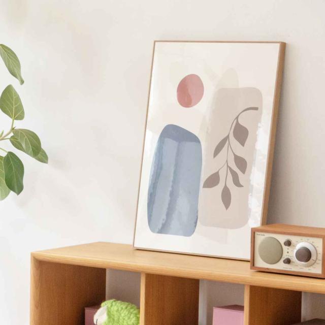 A2サイズは、壁掛けカレンダーや、新聞紙1ページの大きさとほぼ同じくらいの身の回りで多く見られるサイズです。壁に掛けたり、棚の上に立て掛けたり、季節や気分に応じてアートを飾るだけで、いつもの場所がディスプレイコーナーに変身。