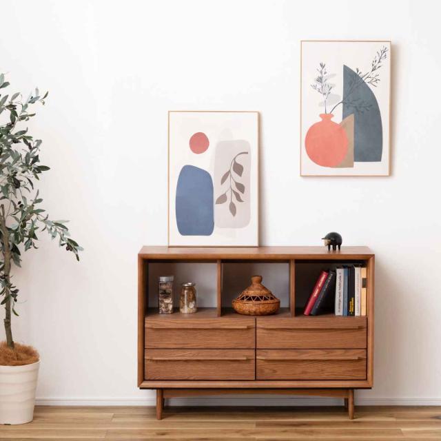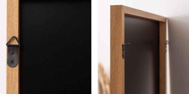 アートを引き立ててインテリアに馴染みやすい、木目調のナチュラルなフレーム付きです。フレーム両側には吊り金具が2個ついています。アートの雰囲気やサイズに合った額を選ぶ手間が省けるのも嬉しいポイントです。