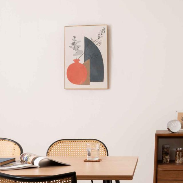 アートを引き立ててインテリアに馴染みやすい、木目調のナチュラルなフレーム付きです。フレーム両側には吊り金具が2個ついています。アートの雰囲気やサイズに合った額を選ぶ手間が省けるのも嬉しいポイントです。