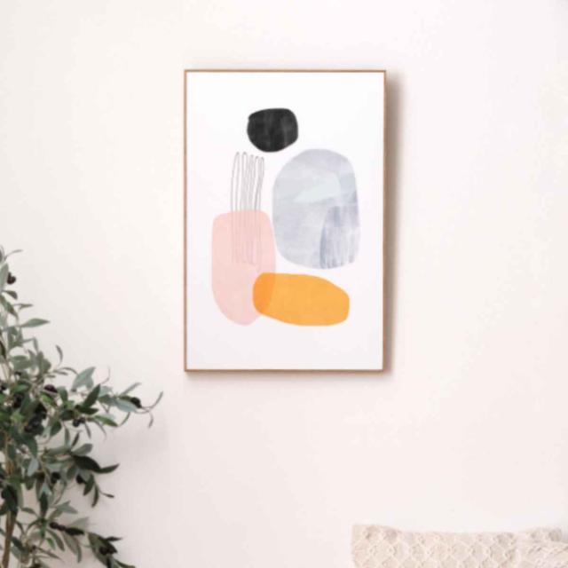 アートを引き立ててインテリアに馴染みやすい、木目調のナチュラルなフレーム付きです。フレーム両側には吊り金具が2個ついています。アートの雰囲気やサイズに合った額を選ぶ手間が省けるのも嬉しいポイントです。
