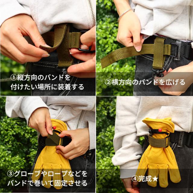 縦方向のバンドをバッグやベルトの付けたい場所に取り付け、横方向のバンドにグローブやロープなどをを巻きつけてマジックテープを止めることで固定できます。